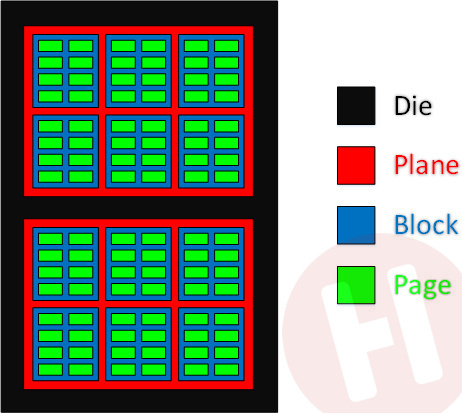 Een versimpelde weergave van hoe pages, blocks en planes zich tot elkaar verhouden binnen één die (chip).