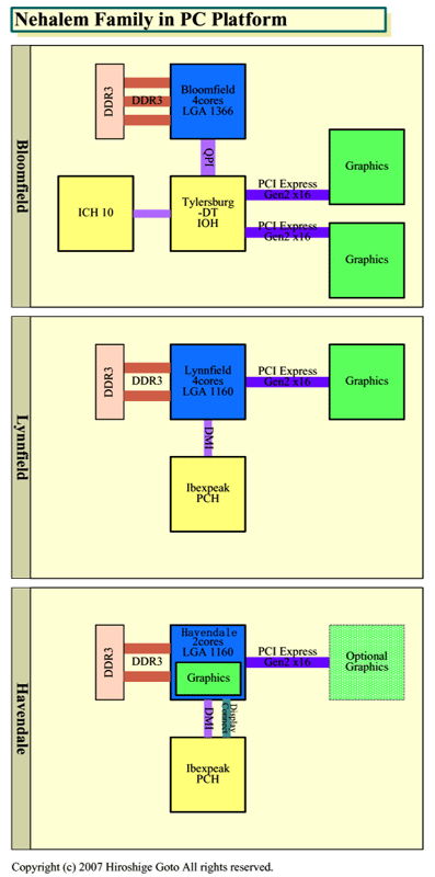 De eerste versie kennen we al geruime tijd met codenaam Bloomfield. Deze wordt een native quad core processor met een drie kanaals onboard geheugencontroller. Deze zal communiceren met de Tylersburg chipset via Quick Path, de seriële opvolger van de Front Side Bus. Bloomfield zal de high-end sector bedienen.
