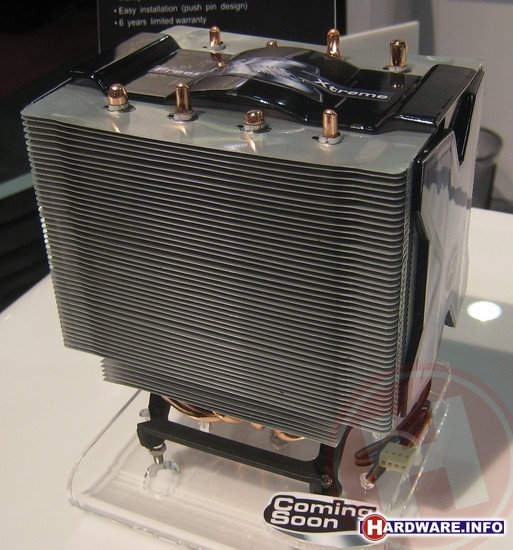 Op haar CES stand heeft Arctic Cooling een prototype van haar nieuwste CPU-koeler getoond. De Freezer Extreme heeft een achttal heatpipes, 226 fins en een halverwege de koeler geplaatste 12 centimeter PWM-fan. Een speciale ophanging voor de koeler zorgt ervoor dat de geluidsproductie tot een minimum beperkt wordt. De koeler is zowel geschikt voor Intel Socket 775 processors als voor AMD Socket AM2(+) chips. Wanneer de Freezer Extreme exact beschikbaar komt, kon men ons nog niet zeggen.