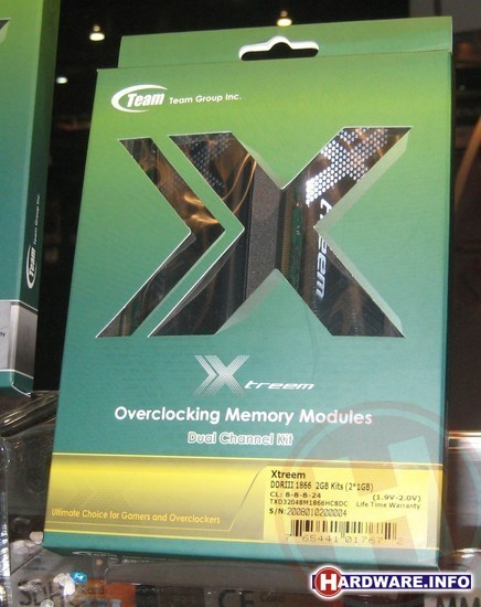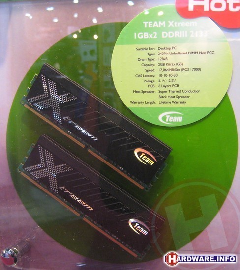 In onze recente DDR3 geheugentest (zie de laatste Hardware.Info Magazine) wisten we al trots te melden dat de 2 GHz grens bij het overklokken van DDR3-modules in zicht is. Team doet daar graag nog een schepje bovenop: op haar CES stand toonde het bedrijf DDR3 modules die gegarandeerd op een snelheid van 2133 MHz moeten kunnen werken. Voor deze klokfrequentie rekent men met 10-10-10-23 latencies en is een spanning van 2,1 à 2,2 Volt vereist. Ook voor DDR2 legt Team opnieuw de lat hoger: zo mogen we binnenkort modules verwachten die officieel op 1300 MHz kunnen werken. Voor de gelegenheid heeft men ook het ontwerp van de Xtreem reeks aangepast; de nieuwe modules hebben een nieuw soort heatspreader en worden tevens in een nieuwe verpakking geleverd. Prijzen van de nieuwe high-end geheugenmodules zijn ons onbekend.