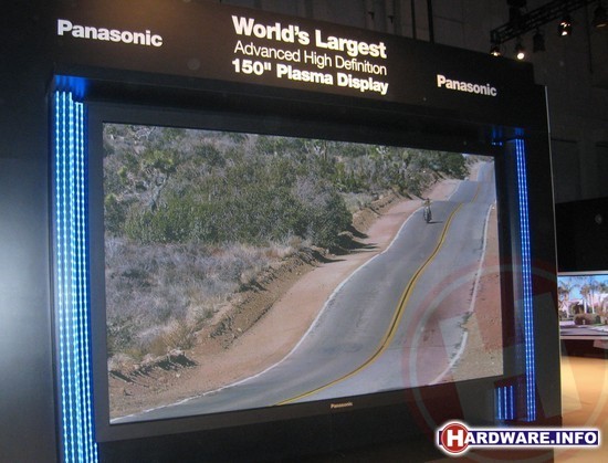 Iedere consumentenelectronica beurs ontstaat er wel een wedloop tussen de verschillende fabrikanten over wie de grootste LCD of plasma televisie kan maken. Tijdens de IFA beurs in September vorig jaar konden verschillende fabrikanten zich met een schermdiagonaal van 102" nog tot winnaar uitroepen, maar daar kijken we op deze beurs inmiddels niet meer van op. Winnaar deze keer is Panasonic met een plasma TV met een duizelingwekkende diagonaal van 150", ofwel bijna vier meter. Op zo'n formaat begin je je bijna af te vragen wanneer Full HD gaat worden opgevolgd door een standaard met een hogere resolutie. Wie zich afvraagt wat zo'n mega TV zal kosten, moeten we het antwoord schuldig blijven. Panasonic is eerlijk genoeg om te zeggen dat het apparaat puur voor de beurs gemaakt is. Te koop is 'ie dus niet, maar mocht dat het geval zijn dan zul je met een ruwe schatting makkelijk twee ton verder zijn. Maar, je kunt dan wel weer aardig wat geld uitsparen aan behang.