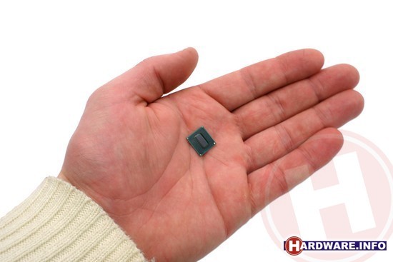 Rechts de piepkleine Atom CPU, in het midden de bijbehorende chipset.