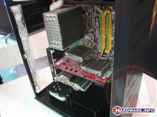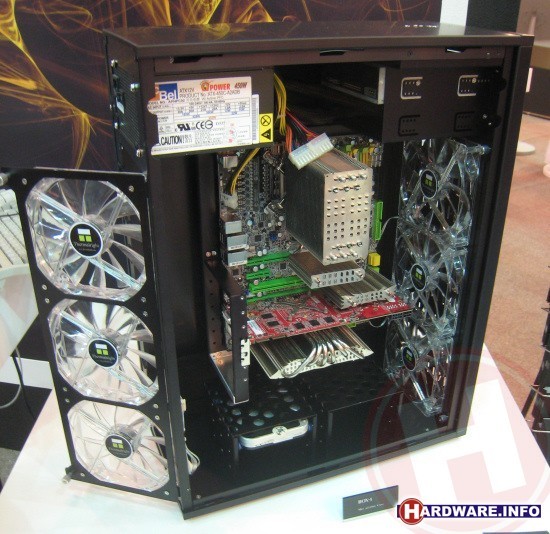 "The ultimate airflow case", zo betitelt Thermalright haar nieuwe Box-1 behuizing. Het ontwerp is dan ook zeer bijzonder te noemen. Bij deze kast zit het moederbord niet tegen de achterwand, maar midden in de behuizing. Zowel aan de voor- als achterzijde zijn boven elkaar drie 14 cm fans ondergebracht. Deze zorgt voor zoveel airflow, dat alle componenten binnen de PC probleemloos passief gekoeld kunnen worden, volgens Thermalright natuurlijk het liefst met haar eigen koelers. Door de fans zeer langzaam te laten draaien, wordt de kast erg stil, terwijl er een goede koeling blijft bestaan. Door de koelers op volle snelheid te laten draaien, ontstaat voor overklokkers een optimale airflow.