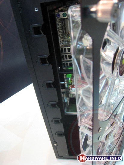 Aangezien het moederbord niet tot aan de achterkant van de kast komt, moet alle aansluitkabels naar de binnenkant van de behuizing gebracht worden. Daarvoor heeft men wat slims bedacht: de achterste rij fans kan eenvoudig opgeklapt worden, waarna de kabels in kleine openingen in het achterpaneel geschoven kunnen worden.