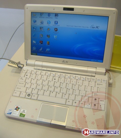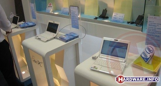 De geruchten waren er al lang, dus 'nieuws' kunnen we het eigenlijk niet meer noemen: ASUS toonde op haar speciale Eee PC-stand - jawel, ze hebben er twee dit jaar! - een nieuw model met 10" scherm. Deze luxere (en duurdere) Eee PC wordt voornamelijk gericht op mensen die de machine zakelijk gaan gebruiken. Naast een groter scherm is ook het toetsenbord groter en bovenal prettiger in gebruik. Een ander belangrijk verschil met de bestaande Eee PC's is dat dit nieuwe exemplaar is voorzien van een harde schijf in plaats van flashgeheugen. Het apparaat is dus iets minder shockproof dan z'n voorlopers, maar kan wel veel meer data opslaan. De Eee PC 1000 is gebaseerd op Intels nieuwe Atom processor.