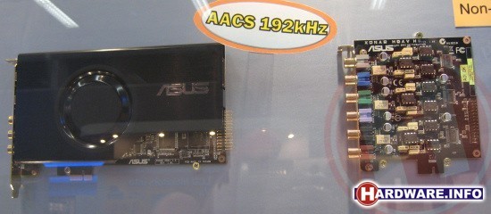 ASUS toonde een tweetal nieuwe HDMI geluidskaarten op haar stand. Beide zijn geheel geschikt voor HDMI 1.3 en daarmee voor moderne Blu-ray schijven met Dolby TrueHD of DTS Master Audio geluidstracks. Daarnaast zijn de kaarten gecertificeerd voor AACS (de audio tegenhanger van HDCP), waardoor het geluid van Blu-ray schijven zonder beperking met maximaal 192 kHz uitgestuurd kan worden. De geluidskaarten hebben zowel een HDMI in- als uitgang. Hierdoor kun je het beeld van de videokaart eerst de geluidskaart in sturen, daar wordt het geluid aan het signaal toegevoegd, waarna je met één kabel de PC weer op een high-end receiver kunt aansluiten.