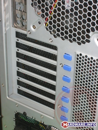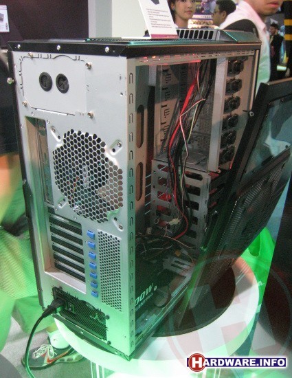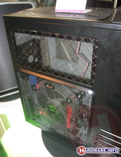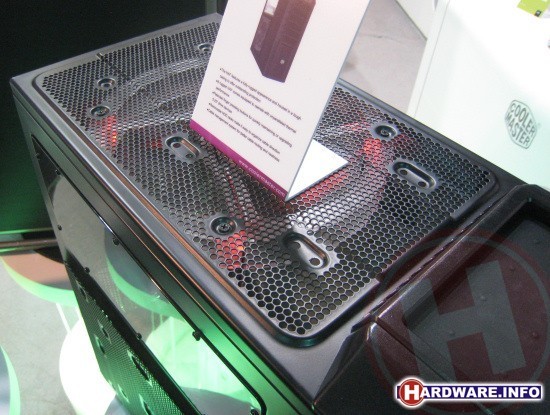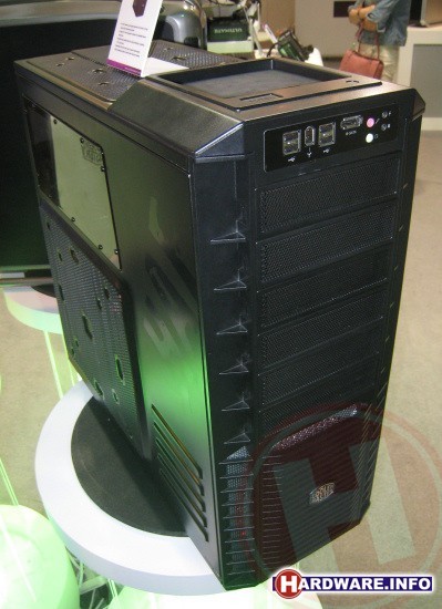 Op de stand van Cooler Master vonden we een nieuwe high-end behuizing die spoedig beschikbaar moet komen. De kast luistert naar de weinig spectaculaire, maar daarmee wel duidelijke naam HAF, wat staat voor High AirFlow. De doelstelling is hiermee meteen bekend; de ontwerpers hebben geprobeerd om een kast met een zo optimaal mogelijke luchtdoorgang te maken. Dat resulteert ondermeer in veel gebruik van mesh panelen - tot aan de backets van uitbreidingskaarten aan toe! - en verder ook veel fans. Standaard is de kast al voorzien van drie 20 cm. fans (voorin, bovenin en in het zijpaneel) en twee 14 cm. fans. Naar wens kun je zelf nog extra exemplaren toevoegen. Optioneel kunnen er in de behuizing ook twee voedingen worden geplaatst. Net al de meeste andere recente Cooler Master behuizingen is ook de HAF voorzien van de handige, schroefloze bevestiging van harddisks en 5,25" devices.