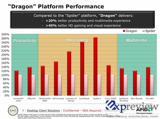 De snelste processor voor het Dragon platform is de Phenom II 940, geklokt op 3 GHz en voorzien van 6MB L3-cache. Met de nieuwe processors behoort ook socket AM3 met DDR3 geheugenondersteuning tot de mogelijkheden. Bij Expreview is een slide verschenen waarin AMD het beste van het Spider platform afzet tegen het beste van het nieuwe Dragon platform.