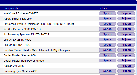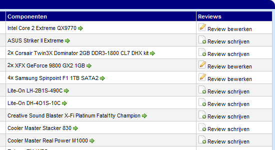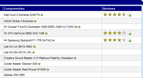 Vandaag hebben we een kleine aanpassing doorgevoerd aan de User Systemen op de site. Tot nu toe als je een systeem van een Hardware.Info bezoeker ging bekijken, zag je rechts naast de producten twee knopjes waarmee je de specificaties en de prijzen van het betreffende product kunt inzien. In de nieuwe versie zijn die knopjes verdwenen en wordt je door op de productnaam te klikken direct doorverwezen naar de productpagina met specs, prijzen en andere informatie. Op de plek waar vroeger de knopjes stonden, vind je de nu beoordelingen van de reviews die de betreffende gebruiker over zijn hardware heeft geschreven. Op die manier zie je in één blik hoe tevreden te persoon over zijn hardware is en kun je uiteraard direct doorklikken naar zijn reviews.