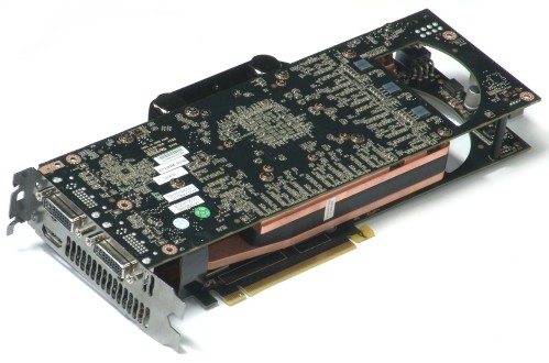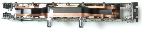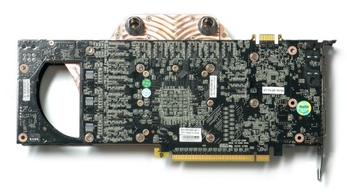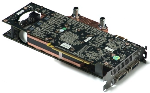 De Zotac GTX 295 met waterkoeling, het koelblok is ingeklemd tussen de twee printplaten