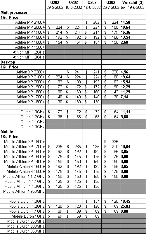 AMD heeft een nieuwe prijslijst bekend gemaakt. De prijzen voor over de gehele linie zijn flink verlaagd. Opvallend zijn ondermeer de Athlon XP 2100+ en Athlon MP 2000+ die bijna 20% goedkoper zijn geworden.