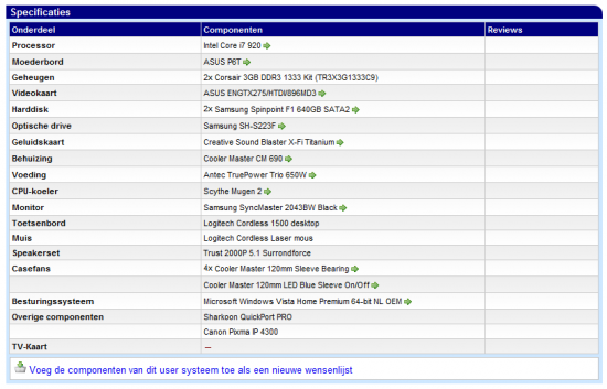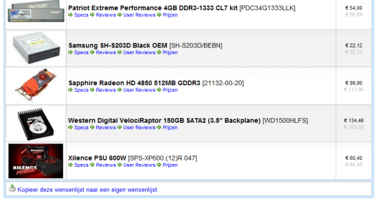 Vanaf vandaag is de wensenlijst functionaliteit van Hardware.Info fors uitgebreid. Het was altijd al mogelijk om met behulp van zo'n wensenlijst producten die je wilde gaan aanschaffen te verzamelen en daarna te bekijken welke shop het totaal voor de scherpste prijs kon leveren. De vernieuwde functionaliteit biedt nog veel meer mogelijkheden, waaronder het maken van meerdere wensenlijsten, het kopiëren van lijsten van andere bezoekers, het exporteren van een lijst naar een forumbericht en het met één muisklik bij een shop bestellen van al je gewenste producten. Bovendien kan je vanaf nu met één druk op de knop de configuratie van een User Systeem, dat je als basis wilt gebruiken voor een eigen configuratie, kopiëren naar een eigen wensenlijst!