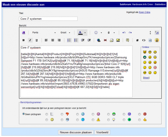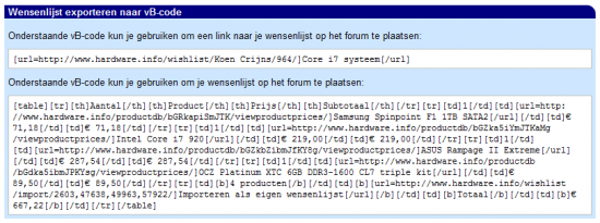 Een andere nieuwe functie van de Hardware.Info Wensenlijst is om je lijstje eenvoudig op het forum te plaatsen. Daarvoor druk je op de wensenlijst pagina op de Wensenlijst exporteren naar vB-code knop. Er verschijnt dan een extra kader waarin je de forum-code terug vindt om ofwel een URL naar de betreffende lijst ofwel de complete lijst in een forumbericht in te voegen. Dat kan handig zijn, bijvoorbeeld wanneer je een systeem aan het samenstellen bent en aan de andere Hardware.Info members hun mening over de gekozen componenten wil vragen.