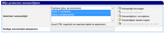 Rechts naast het overzicht met al je wensenlijsten vind je knoppen om diverse taken uit te voeren. Allereerst is er de optie Wensenlijst toevoegen, die zoals de naam al aangeeft een nieuwe, lege wensenlijst aanmaakt. Standaard krijgt zo'n nieuwe lijst een volgnummer als naam, maar die kun je uiteraard direct aanpassen. Met de optie Wensenlijst kopiëren kun je de huidige wensenlijst een tweede keer in het overzicht zetten. Dat kan handig zijn wanneer je bijvoorbeeld een systeem gaat samenstellen en wil controleren wat er met de prijs gebeurt als je alleen de processor en het moederbord aanpast. De knop Wensenlijst(en) verwijderen spreekt natuurlijk voor zich: hiermee gooi de op dit moment geselecteerde lijsten weg. Wensenlijsten samenvoegen is alleen beschikbaar wanneer je door de CTRL-toets in te houden twee of meer lijsten hebt geselecteerd: je kunt de producten in de betreffende lijsten dan samenvoegen in één nieuwe lijst. Met de knop Wensenlijst exporteren naar vB-code kun je de huidige lijst in een forumbericht zetten.