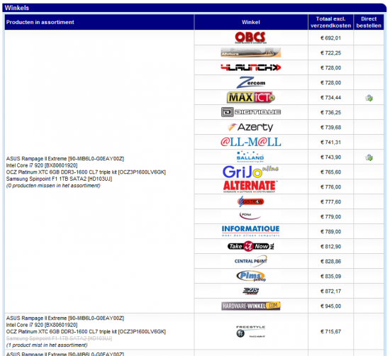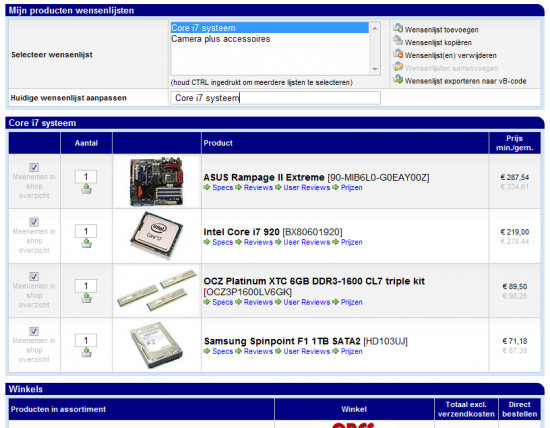 Het shopoverzicht onderaan de wensenlijst pagina is ook vernieuwd. Net als tot nu toe zie je allereerst een lijstje van shops die alle gewenste producten in hun assortiment hebben, inclusief een totaalprijs. Daarnaast volgen overzichten van shops die alles behalve één of alles behalve twee producten hebben. Nieuw zijn de knopjes in de kolom Direct bestellen. Hiermee kun je alle producten met één muisklik in het winkelmandje van een shop plaatsen. Deze functionaliteit is op dit moment alleen beschikbaar bij launch partners Salland Automatisering en Max ICT, maar spoedig zullen we deze functionaliteit ook voor andere shops beschikbaar stellen.