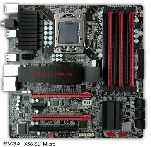 De EVGA X58 SLI Micro (141-BL-E756) heeft dezelfde kleurstelling als het Classified moederbord. Het micro-ATX moederbord biedt ruimte aan twee PCI-Express x16 2.0 sloten, een PCI-Express x1 slot en een PCI-slot. Ook dit bord heeft, net als de X58 SLI LE, een 6-phase analog PWM ontwerp met een enkele EPX 12v connector en bovengenoemde DDR3 geheugenmodules, SATA-aansluitingen, LED-display en heatsink.