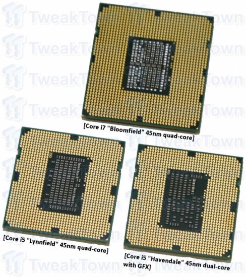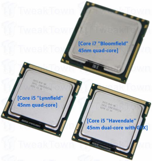 Op de foto zijn de nieuwe processors van Intel te zien, het verschil in grootte is meteen duidelijk. De Core i7 voor Socket 1366 tegenover de Socket 1136 Core i5 ‘Lynnfield’ zonder geïntegreerde GPU en de Core i5 ‘Havendale’ met geïntegreerde GPU.