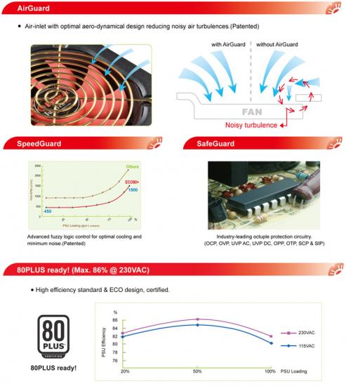 De niet modulair uitgevoerde Enermax ECO80+ is 140 x 150 x 86 mm groot en voorzien van de SpeedGuard-, Twister Magnetic Bearing- en AirGuard-technologie, waarmee een stille werking gewaarborgd zou moeten zijn. De gewelfde 120mm ventilator draait, afhankelijk van de temperatuur, op 500 tot 2000 rpm. De fabrikant claimt dat haar nieuwe voedingen ideaal zijn om een plek te krijgen in een HTPC.