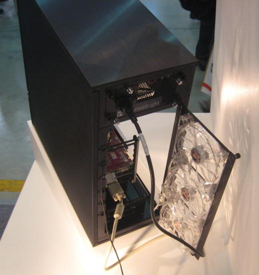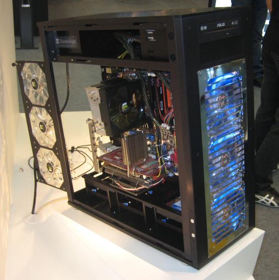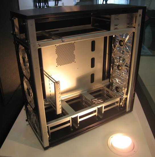 In onze berichtgeving over Computex 2008 besteedden we aandacht aan een prototype behuizing van Thermalright met een uistekende airflow. De betreffende kast is het afgelopen jaar helaas nooit op de markt gekomen, maar nu toont men een jaar na dato het uiteindelijke resultaat. De kast luistert naar de naam Box One en valt vooral op doordat het moederbord letterlijk midden in de kast geplaatst wordt. Hierdoor kunnen zowel aan de voorzijde als aan de achterzijde een zestal 12cm casefans geplaatst worden, die binnen de gehele behuizing voor een uitstekende luchtverplaatsing zorgen. De kabels zijn netjes weg te werken door inkepingen in de deur aan de achterzijde. Onderin de Box One kunnen een zestal harde schijven geplaatst worden, bovenin is er ruimte voor de voeding en twee 5,25" drives. De prijs van de behuizing kon men helaas nog niet bekend maken.