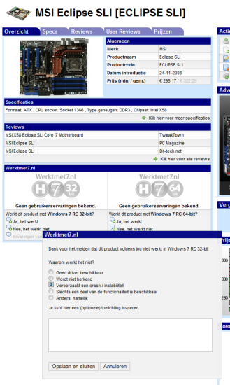 Uitgekomen op het Overzicht tabblad van de productpagina, kun je in de kolom voor Windows 7 32-bit óf 64-bit kiezen voor de opties Ja, het werkt en Nee, het werkt niet. In de daarna verschijnende box kun je optioneel nog een toelichting schrijven, bijvoorbeeld wanneer je een specifieke driver moest gebruiken. Wanneer je hebt aangeklikt dat een product niet werkt, kun je snel kiezen uit een lijstje met redenen. Een druk op de knop Opslaan is voldoende om je ervaring aan de Werktmet7.nl toe te voegen!