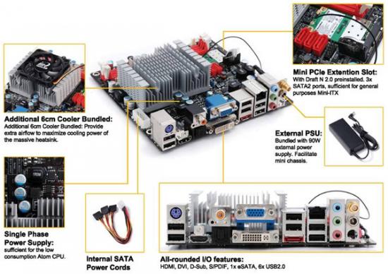 Qua geheugen is er ruimte voor twee DDR2-667/800 geheugenmodules waarmee de gebruiker een maximale capaciteit van 8GB kan creëren. Verder voorziet het moederbord in de GeForce 9400 IGP, één eSATA-, drie SATA II-aansluitingen, Gigabit Ethernet en 5.1 kanaals audio. Voor de aansluitingen op de achterzijde is gekozen voor D-Sub, DVI en HDMI. Het moederbord zal geleverd worden met een ventilator en een externe PSU. Over de prijs en verkrijgbaarheid in Nederland is vooralsnog niets bekend.
