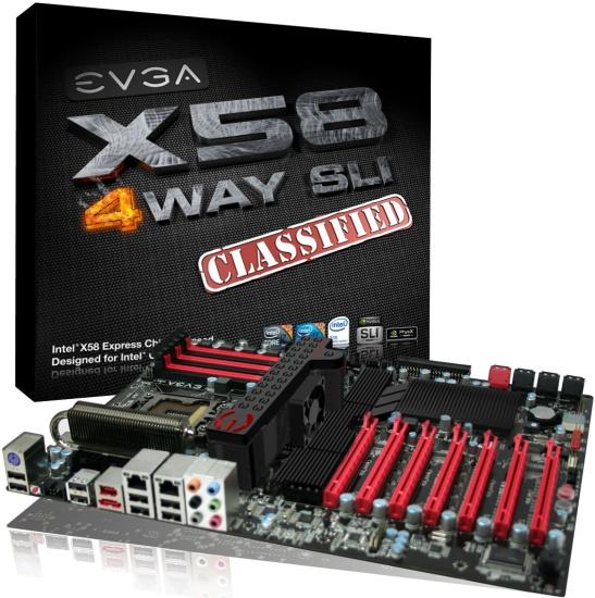 Mogelijk als antwoord op de dual-GPU Mars videokaart van ASUS heeft EVGA 's werelds eerste 4-way, ook wel quad-SLI, GeForce GTX 285 videokaart aangekondigd, de GTX 285 Classified. Quad-SLI maakt het mogelijk om de kracht van vier GT200 chips te bundelen. Niet ieder moederbord kan echter zomaar overweg met vier high-end videokaarten, laat staan de nodige bandbreedte aanbieden om het onderste uit de kan te halen. EVGA lijkt daar echter ook bij stilgestaan te hebben en presenteerde tegelijkertijd haar X58 Classified 4-Way SLI Edition moederbord.