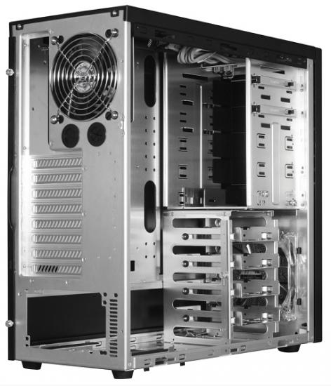 Wie de nieuwe Lian Li kasten wil gaan vullen met energieslurpende high-end hardware zal wellicht telerugesteld worden door de aanwezigheid van slechts twee ventilators, namelijk één 140mm intake en één 120 mm outtake die werken op respectievelijk 1000 en 1200 tpm. Wél heeft Lian Li gedacht aan waterkoeling, want door de twee gaten in de achterkant kan ook een externe waterkoelingset netjes worden aangesloten. Opvallend is de aanwezigheid van acht PCI brackets, zodat er ook in het onderste slot van een ATX moederbord een tweeslots videokaart geïnstalleerd kan worden.