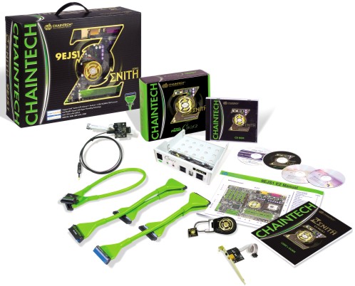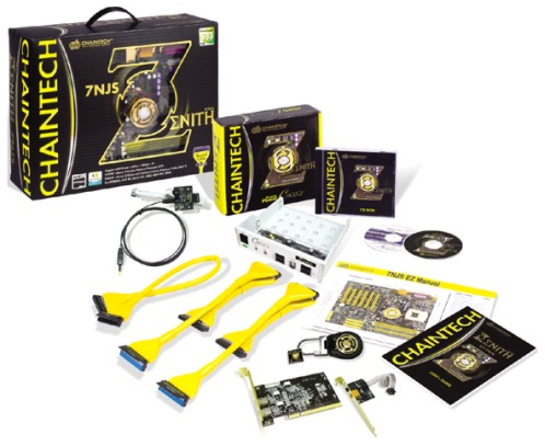 De specificaties liegen er niet om, in de dikke, stevige en mooie doos kun je het moederbord al door het raampje bewonderen. Als extra’s worden ook weer afgeronde IDE en FDD kabels meegeleverd. De IDE-kabels zijn iets langer dan bij de Apogee, in de doos van de Zenith zitten namelijk exemplaren met een lengte van 60 cm. Behalve deze kabels heeft Chaintech ook nog een speciale Zenith-casebadge en een sleutelhanger meegeleverd. De hoofdtelefoon die bij de Apogee wordt geleverd zit echter niet in het pakket.