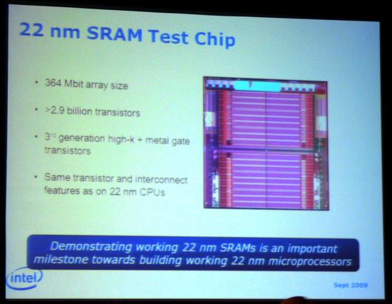 De geproduceerde testchip is een SRAM-chip. SRAM-geheugen wordt in normale processors ondermeer gebruikt als cache-geheugen. Het is gebruikelijk dat Intel een nieuw productieprocedé in eerste instantie uitprobeert met relatief simpele SRAM-chips en later experimenteert met complexere ontwerpen. De geproduceerde chip bevat 364 Megabit geheugen (45,5 Megabyte) en bevat meer dan 2,9 miljard transistors. De chip gebruikt dezelfde soort transistors en verbindingstechnieken zoals men in de toekomst ook bij 22 nm processors zal gebruiken. De testwafers maken gebruik van derde generatie high-k metal gate transistors. Deze technologie, die zorgt voor zeer lage energielekken, werd door Intel voor het eerst bij de 45 nm transistors ingezet. Om haar concurrenten niet slimmer te maken dan ze al zijn, wil Intel niet vertellen wat men exact aan haar productieproces heeft aangepast om 22 nm mogelijk te maken.