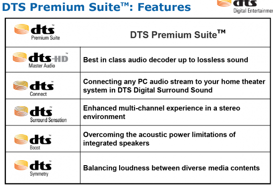 DTS heeft aangekondigd met een extra softwarepakket voor moederborden met ALC5501 codec uit te zullen komen. Deze DTS Premium Suite bevat verschillende zaken, die alle grotendeels hardwarematig door de Realtek DSP verwerkt kunnen worden. Zo kan de chip zoals gezegd DTS HD Master Audio tracks decoderen. DTS Connect biedt de mogelijkheid om surround geluid van de PC realtime te encoderen naar een DTS-stream en zo door te sturen naar een versterker. DTS Sound Sensation is een technologie om met slechts twee speakers toch een surround effect te creëren. DTS Boost is volgens de makers een technologie om muziek beter te laten klinken om de relatief slechte speakers die vaak in een laptop zitten of bij een PC worden geleverd. DTS Symmetry tenslotte zorgt ervoor dat het volume van verschillende zaken die je afspeelt onderling niet teveel afwijkt.