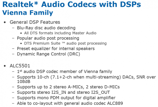 Tijdens een sessie van het Developer Forum van dit jaar heeft Intel samen met Realtek aankondigd dat men spoedig met DSP-chips op de markt komt. De eerste is de ALC5501, welke ondermeer ondersteuning biedt voor het hardwarematig decoderen van alle denkbare Blu-ray audiosporen, het hardwarematig uitvoeren van equalizer en volume aanpassingen en het hardwarematig uitvoeren van dynamic range control. De 5501 is een 10-kanaals chip (7.1 kanalen voor de hoofdspekers en twee losse kanalen voor een eventuele extra koptelefoon) en moet een signaal-ruis verhouding van meer dan 108 dB bieden.