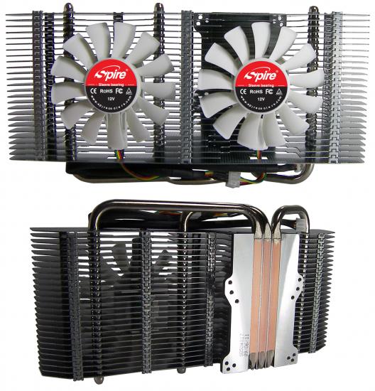 Spire heeft een nieuwe aftermarket koeler aangekondigd voor onder andere de ATI Radeon X2400-, HD3800-, HD4800-series en nVidia’s GeForce 5900-, 9800- en GTX 285-series. De Spire Slimod koelt de GPU door middel van drie koperen Direct Touch heatpipes, dertig aluminium vinnen en twee 80 mm PWM-ventilatoren die tussen de 1000 en 2400 omwentelingen per minuut maken. De vinnen zijn vernikkeld, evenals de meegeleverde heatsinks voor de geheugenchips. Volgens Spire zou de Slimod een GPU tot 280 watt koel moeten kunnen houden, terwijl de ventilatoren maximaal 24 dB(A) aan geluid zouden moeten genereren. Neem een kijkje op de productpagina van de fabrikant voor alle specificaties en de volledige lijst met ondersteunde GPU’s.
