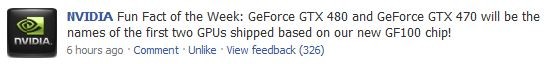 nVidia heeft op zijn Facebook pagina de namen van de eerste twee videokaarten gebaseerd op de GF100 GPU onthuld. De GeForce GTX 470 en GTX 480 moeten de plaats van het huidig vlaggenschip, de GeForce GTX 295, overnemen.