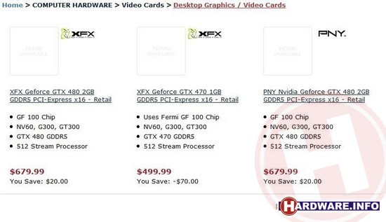 De nVidia GeForce GTX 480 met 2 GB GDDR5 geheugen en Fermi GF100 chip is bij zowel PNY als XFX beschikbaar voor een prijs van $680 USD. De iets langzamere nVidia GeForce GTX 470 met 1 GB GDDR5 geheugen is verkrijgbaar van XFX voor afgerond $500 USD. Volgens de website hebben beide kaarten 512 stream processors aan boord, maar andere bronnen vermelden 448 shaders voor de GTX 470.