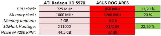 ASUS' Ares videokaart zal gepositioneerd worden binnen de Republic of Gamers (ROG) serie. Zoals gezegd combineert de kaart twee volwaardige HD 5870 chips op een aangepaste printplaat. De kloksnelheid van beide zal dan ook 850 MHz bedragen, tegenover 725 MHz van de 'gewone' HD 5970. Ook aan boord is niet minder dan 4 GB GDDR5-geheugen dat een effectieve snelheid van 4800 MHz heeft, waar dit normaliter 4000 MHz is. Chips en geheugen communiceren over twee 256-bit geheugenbussen. Het geheel wordt gekoeld door de nodige koperen koellichamen en acht heatpipes. Een enkele 100 mm ventilator op 4200 tpm moet de warmte vervolgens bij een beperkte geluidsproductie afvoeren.