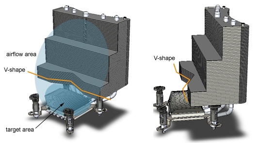 Het Nederlandse Nexus heeft de laatste hand gelegd aan een nieuw type processorkoeler, namelijk de VCT-9000. Deze koeler heeft in grote lijnen het ontwerp van een tower model koeler, waarbij een aantal heatpipes de warmte van de processor naar de heatsink transporteren. Wat deze Nexus vooral bijzonder maakt is de plaatsing van de ventilator, want deze blaast de lucht schuin in het koelblok. In combinatie met de trapsgewijs vormgegeven heatsink moet dat zorgen voor meer luchtweerstand en dus een betere warmteoverdracht van de aluminium koelvinnen naar de lucht. Ook stroomt er op deze manier een deel van de lucht langs het socket naar de koelblokken op de stroomvoorziening op het moederbord