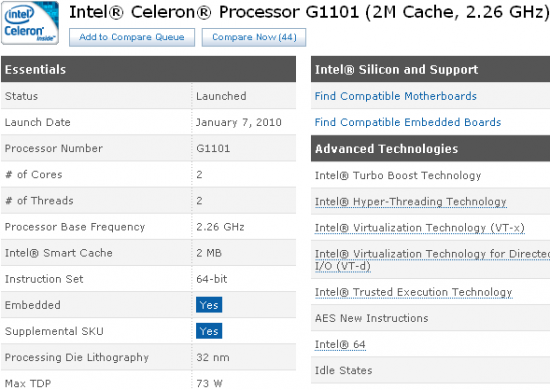 Intel heeft heimelijk haar eerste Celeron processor op basis van de Clarkdale architectuur geïntroduceerd, zo blijkt uit specificaties verschenen op haar ARK website. Hier wordt melding gemaakt van een Intel Celeron G1101, tot nu toe de enige telg uit de Celeron G1000 serie, die voorzien is van een geïntegreerde grafische chip.