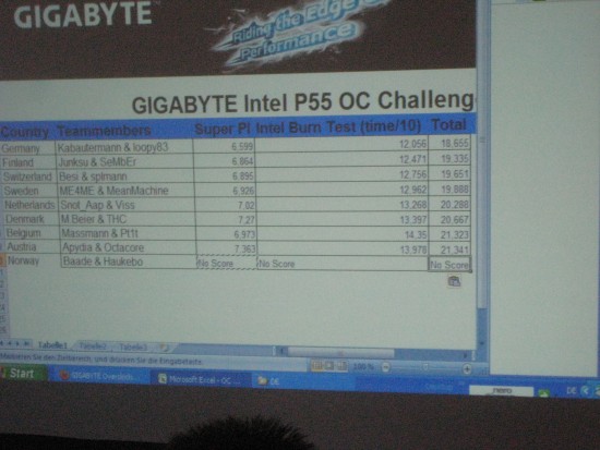 De eindscore van de Gigabyte Intel P55 Challenge. Duitsland heeft gewonnen. Zweden werd vierde, Nederland vijfde en Belgie kwam op de zevende plaats.