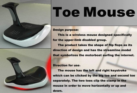De draadloze Toe Mouse is ontworpen voor mensen die een PC niet met een conventionele muis kunnen - of willen - bedienen. Het ergonomisch ontwerp is door Liu Yi voorzien van een fris uiterlijk dat doet denken aan een gestroomlijnde boot. Voor het gebruik van de Toe Mouse moet men deze ‘aantrekken’ als een teenslipper, vervolgens doet de sensor onder de dikke teen dienst als linkermuisknop en de knop onder de tweede teen werkt als rechtermuisknop. De cursor op het scherm zal de bewegingen van de voet naar links, rechts, boven en beneden volgen. Op het moment van schrijven is deze Toe Mouse nog een concept en wat de bijzondere muis moet gaan kosten, mocht het apparaatje überhaupt op de markt komen, is zodoende onbekend.