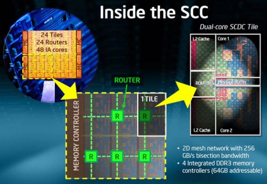 Intel heeft de volgende stap in haar Tera-scale onderzoeksprogramma gezet door de vorig jaar tentoongestelde 48-core processor dit kwartaal aan enkele eersteklas universiteiten te gaan leveren. Dat is echter pas het begin, want de toegepaste technologieën zijn geschikt om probleemloos te schalen naar honderd(en) rekenkernen. Architectureel gezien heeft de chip daarmee veel weg van een volledig cloud computing netwerk en Intel heeft de rekeneenheid dan ook gedoopt tot de single-chip cloud computer (SCC).