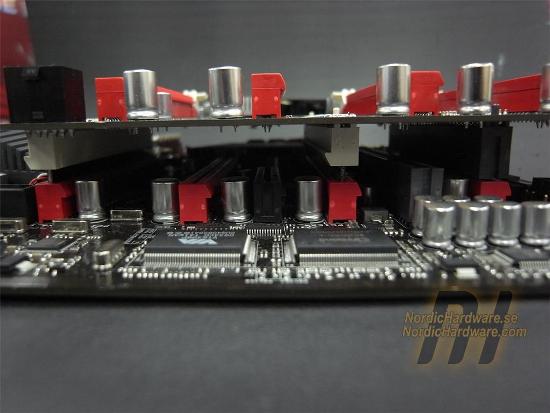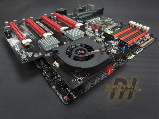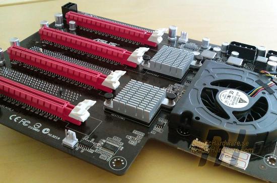 De ROG Xpander moet natuurlijk ook stroom kunnen leveren over de vier videokaartsloten en daarom vinden we rondom de kaart driemaal molex en één PCI-Express 6-pins stroomaansluiting. De ingebouwde ventilator zorgt voor airflow onder de kaarten door en langs de twee NF200 chips. De ROG Xpander kaart zelf gebruikt ongeveer 24 watt aan stroom, maar deze wordt niet onttrokken uit de videokaartsloten die rechtstreeks op het ASUS moederbord zitten. Het is misschien ook wel mogelijk om deze expander kaart op andere moederborden te gebruiken, iets wat de eerste eigenaars vast wel een keer zullen proberen.