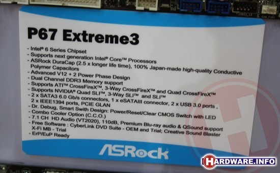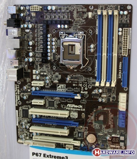 Het lijstje met specificaties dat ASRock bij haar P67 Extreme3 bord heeft opgehangen bevestigt een ander gerucht: slechts twee van de zes Serial ATA poorten van de P67 chipset zijn Serial ATA 600, de overige vier zijn standaard 300 poorten. Hier heeft Intel dus duidelijk een achterstand op AMD. Zowel het ASRock als het MSI moederbord, dat overigens nog geen naam heeft, bevat losse USB 3.0 controllers, een bevestiging van USB 3.0 niet tot de standaard uitrusting van de P67 chipset behoort.