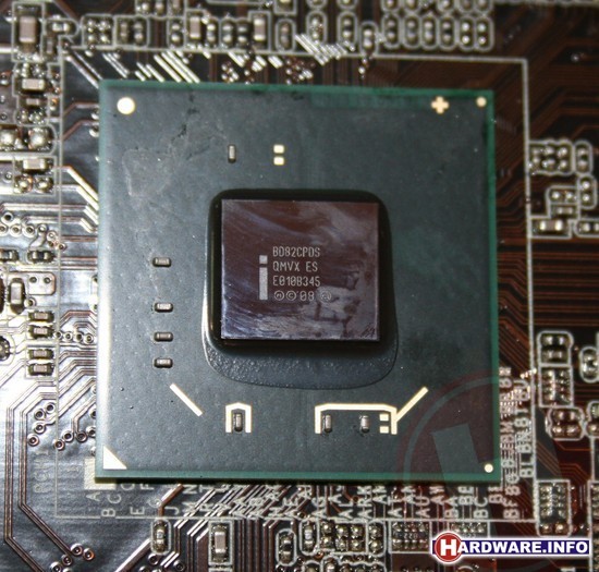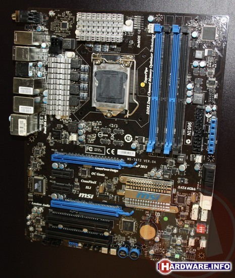 Het MSI bordt lijkt te gaan evolueren tot een Big Bang bord: zo zien we ondermeer de OC Genie knop en voltage meetpunten. Daarnaast maakt dit bord gebruik van de door MSI gepromote military class componenten. De gebruikte koeling is tijdelijk en zal voor het uiteindelijke bord aangepast worden.