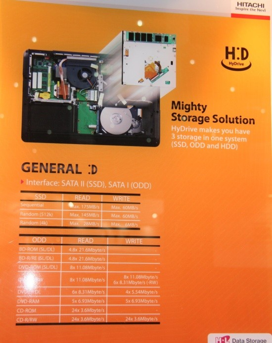 Zo is de huidige HyDrive, de eerste generatie, uitgerust met twee losse SATA-aansluitingen, eenmaal SATA 3.0 Gbit/s en eenmaal SATA 1,5 Gbit/s, en is de optische drive in staat Blu-ray schijfjes te lezen en DVD's en CD's tevens te beschrijven. De maximale lees- en schrijfsnelheid van de Indilinx controller in de SSD zou blijven steken op respectievelijk 175 MByte/s en 60 MByte/s. Opslaggroottes werden niet vermeld, maar eerder werd al bekend dat de eerste modellen met 32 of 64 GB aan MLC-chips zullen komen.