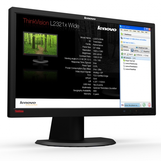 De L2321x is een 23" monitor die in staat is twee videosignalen tegelijkertijd weer te geven, waarbij een maximumresolutie van 1920x1080 pixels ondersteund wordt. Om de dualscreen weergave mogelijk te maken combineert het scherm de Displayport ingang met de traditionele analoge VGA-aansluiting. De maximale resolutie wordt verdeeld over de twee poorten. Lenovo's nieuwste creatie heeft een kijkhoek van 170° en 160° voor respectievelijk horizontaal en verticaal. De contrastratio bedraagt 5 ms en de helderheid is op 250 cd/m² vastgesteld. Geïntegreerd in het scherm is ook een USB-hub, die eenvoudig op het secundaire signaal weergegeven kan worden. Volgens Lenovo zou het scherm tijdens actief gebruik van beide signalen niet meer dan 28 watt moeten verbruiken.