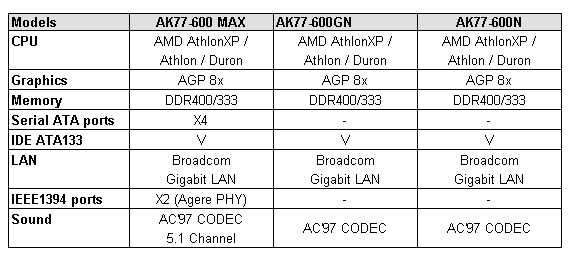 AOpen lanceert een drietal moederborden voorzien van de nieuwe KT600-chipset van VIA. Deze chipset biedt ondermeer een 400 MHz FSB en ondersteuning voor DDR400-geheugen. De AK77-600 serie bestaat uit de AK77-600 MAX, AK77-600GN en de AK77-600N. Al deze borden zijn voorzien van gigabit-LAN.
