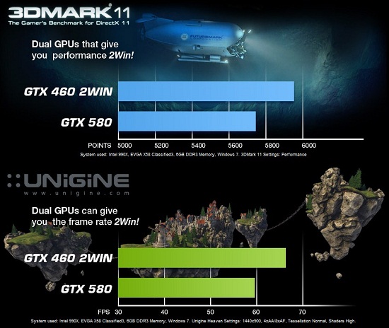 De twee GPU's van de GTX 460 2WIN werken op 700 MHz en zijn gezamenlijk goed voor 672 shader units, waarmee de kaart een heel stuk sneller is dan een high-end kaart zoals de 512 shader units tellende GeForce GTX 580. Beide GPU's op deze GTX 460 2WIN spreken via een 256-bits geheugencontroller 1 GB aan geheugen aan, dat werkt op een effectieve klokfrequentie van 3600 MHz GDDR5. Ten opzichte van de standaard GTX 460 heeft EVGA de GPU's ook iets opgevoerd, namelijk van 675 naar 700 MHz core clock. De 672 shaderunits werken zodoende op de dubbele snelheid van 1400 MHz.