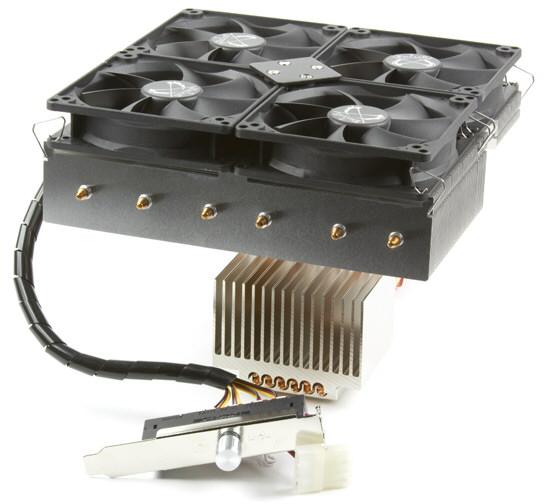 De high-end processorkoeler belooft goede koelprestaties waar te gaan maken met 12 koperen heatpipes. Op de basis zelf is nog een aluminium heatsink geplaatst voor extra afgifte van warmte, terwijl de meeste warmte naar het koelblok erboven zal worden geleid. Op deze heatsink zijn de vier ventilatoren in een vierkant geplaatst. Deze 100 mm Scythe Slip Stream fans hebben een variabel toerental van 500 tot 2000 r.p.m. en maken maximaal 38 dB(A) aan geluid. Het toerental van de fans is regelbaar met een fancontroller die in een PCI bracket van de behuizing geplaatst kan worden.