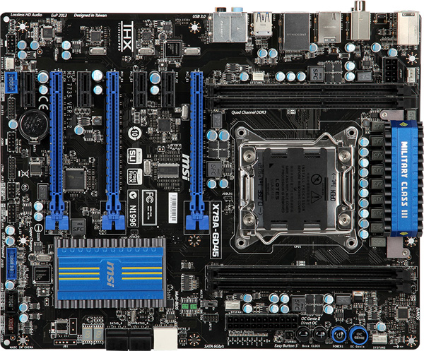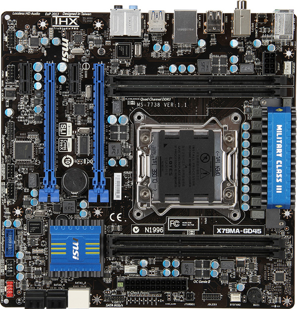 Het MSI X79MA-GD45 moederbord heeft het micro-ATX formaat. Rondom de Socket 2011 vinden we een 8-fase stroomvoorziening, alsmede vier DDR3 sloten voor een quad-channel configuratie. MSI heeft twee PCI-Express 3.0 x16 sloten en twee PCI-Express x1 sloten voor insteekkaarten geplaatst. Verder zijn vier SATA 3 Gbps- en twee SATA 6 Gbps-aansluitingen, vier USB3.0-poorten, 7.1 audio (analoog en digitaal), Gigabit LAN, zes keer USB2.0 en een PS/2 combi connector.