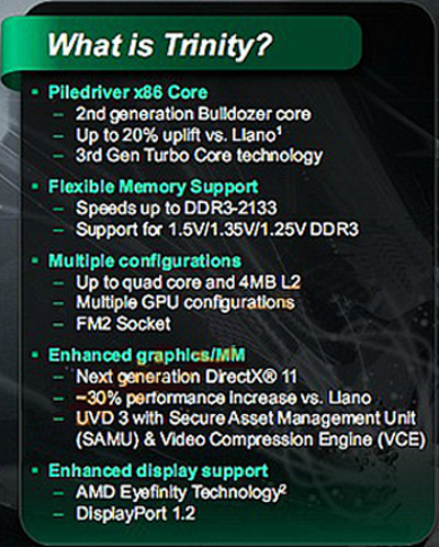 De Trinity APU’s worden gefabriceerd volgens het 32nm procedé, heeft vier rekenkernen, is compatible met x86 en zou 20% betere prestaties hebben ten opzichte van de Llano APU’s. Verder is de grafische kern opnieuw ontworpen en geschikt voor DirectX 11, hier zouden de prestaties zijn toegenomen met 30%.